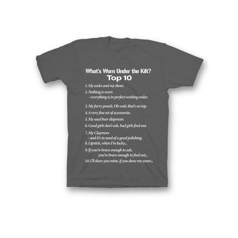 Прикольная, смешная мужская футболка с надписью "What is worn under the kilt". Футболка с прикольным принтом подходит для подростков, для мужчин, для взрослых. Отлично подходит как подарок на День Рождения папе, парню, мужу. Прикольная надпись на футболке выделит вас из толпы и подчеркнет уникальность. Футболки идут размер в размер и должны смотреться свободно, поэтому не следует выбирать слишком маленький размер, а лучше выбрать размер с запасом. По умолчанию в товаре указан выбор мужских размеров. Женские размеры - на 1 размер меньше чем мужские. Все мужские футболки со смешными надписями состоят из 100% хлопка. Цвет: темно-серый, с белым принтом.