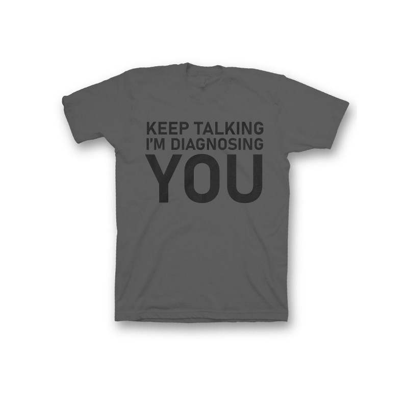 Прикольная, смешная мужская футболка с надписью "Keep talking im diagnosing". Футболка с прикольным принтом подходит для подростков, для мужчин, для взрослых. Отлично подходит как подарок на День Рождения папе, парню, мужу. Прикольная надпись на футболке выделит вас из толпы и подчеркнет уникальность. Футболки идут размер в размер и должны смотреться свободно, поэтому не следует выбирать слишком маленький размер, а лучше выбрать размер с запасом. По умолчанию в товаре указан выбор мужских размеров. Женские размеры - на 1 размер меньше чем мужские. Все мужские футболки со смешными надписями состоят из 100% хлопка. Цвет: темно-серый, с черным принтом.